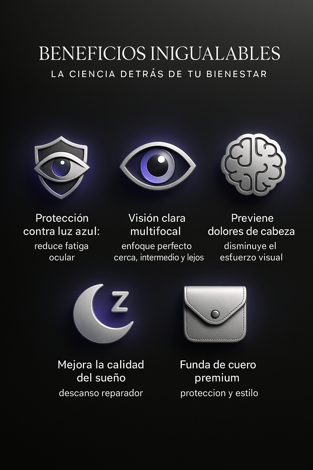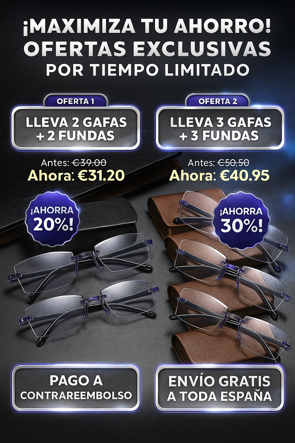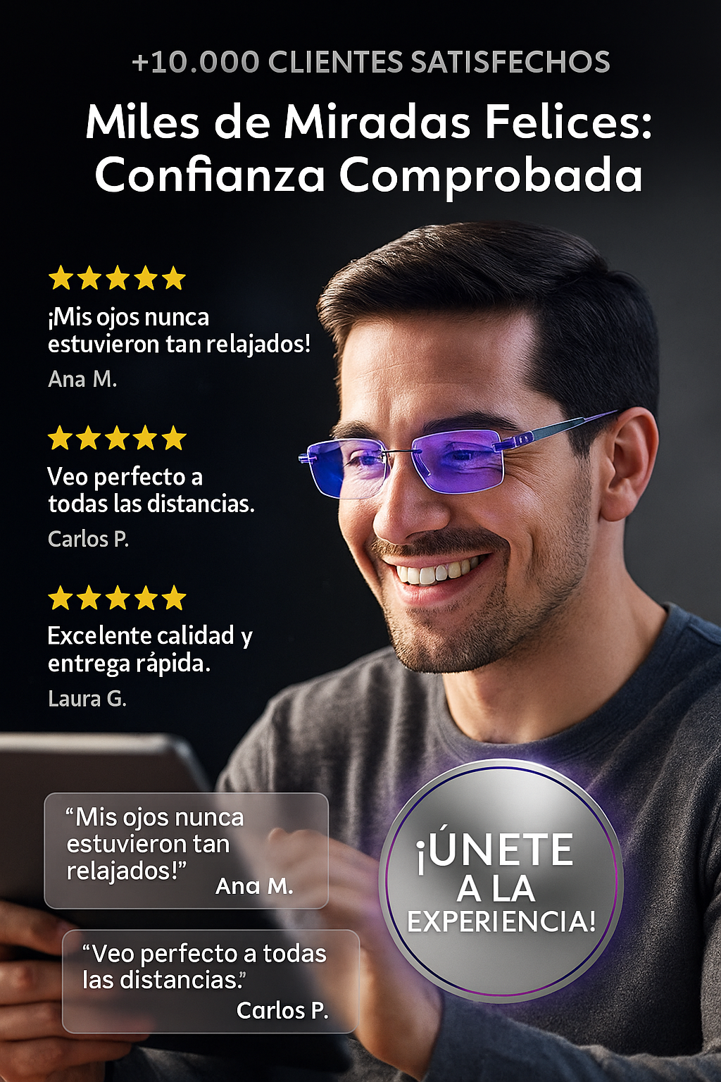 Las Gafas Inteligentes Visión pro con Zoom automático son la revolución. Ajustan su enfoque al instante según la distancia de lo que miras. Es como si tus ojos recuperaran su juventud: una visión nítida de cerca, de lejos y en pantallas, sin distorsiones ni reflejos.